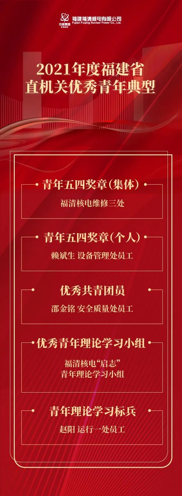 近日,福建省直机关团工委发布《关于表扬2021年度省直机关优秀青年典型的决定》(团闽委工通知〔2022〕8号),完美体育平台集团福清核电多个集体和青年受到表彰。